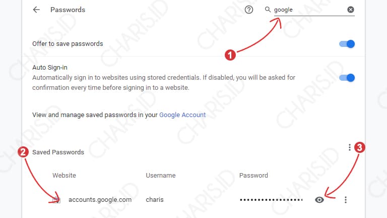 - Agar lebih memudahkan dalam pencarian, silahkan ketikkan google di kolom pencarian. Setelah itu, fokus pada website pada bagian accounts.google.com (pilih sesuai username email Anda) lalu klik icon mata untuk melihat password.