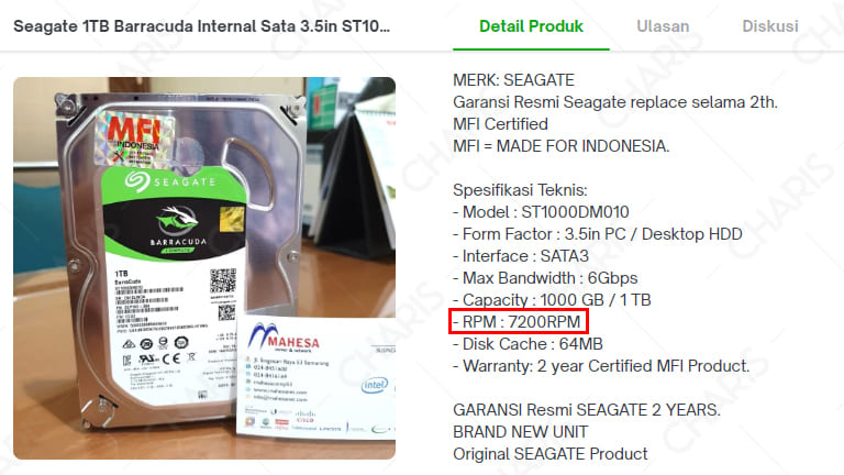 Pada contoh di atas, saya menemukan informasi mengenai RPM hardisk yang saya gunakan melalui website Tokopedia. Sebenarnya mau website apa saja juga tidak masalah karena yang paling penting adalah informasi mengenai spesifikasi hardisk tersebut.